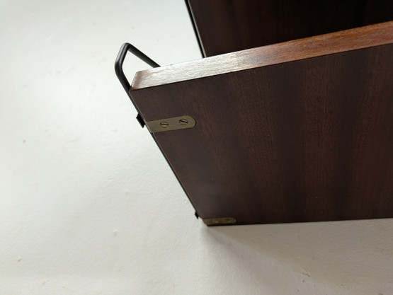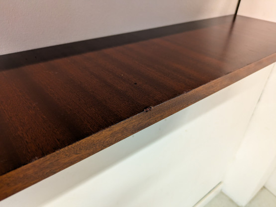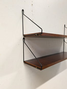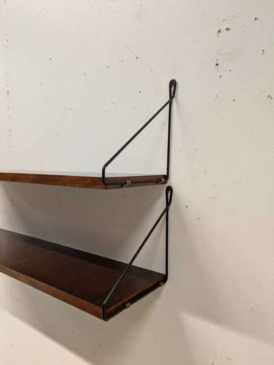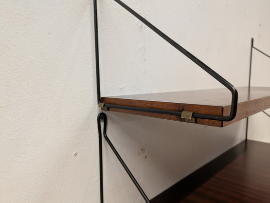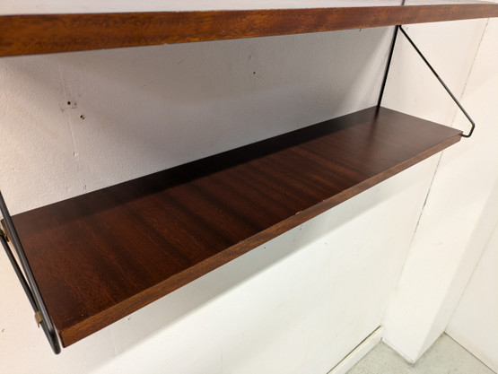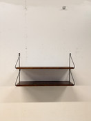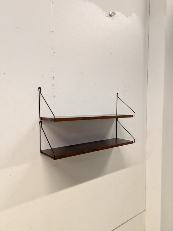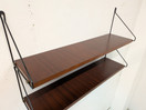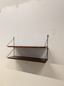 Kaksiosainen 60-luvun string henkinen seinähylly myytävänä. Kunto ikäisekseen hyvä. Pari kolhua ja rinkulaa hyllyissä.
